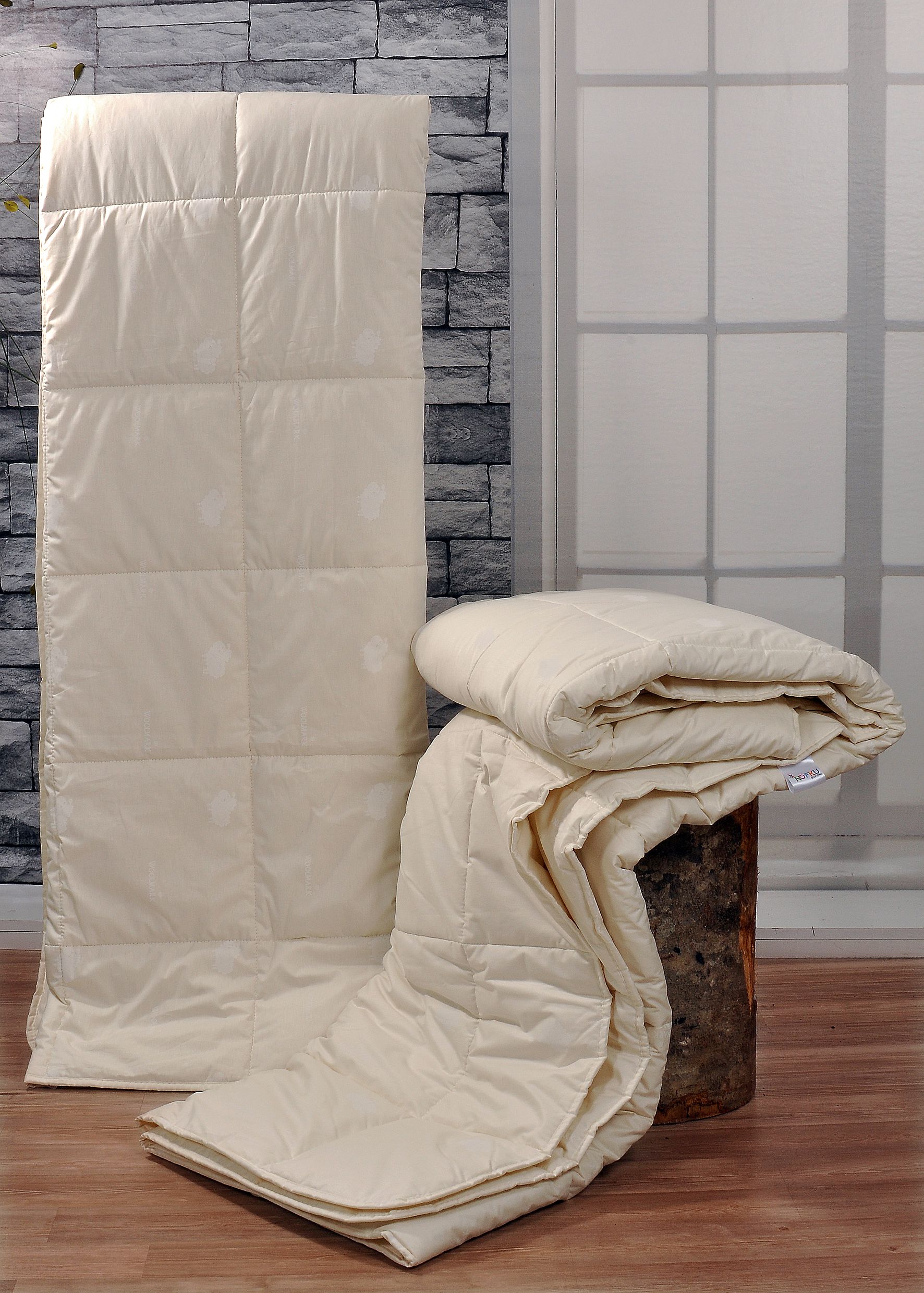 Nofku Yün Yorgan. Tek kişilikliktir. 155 cm x 215 cm ebatlarındadır. %100 pamuk kumaş %100 woolmark onaylı yün dolgusu kullanılmaktadır. Krem renktir.